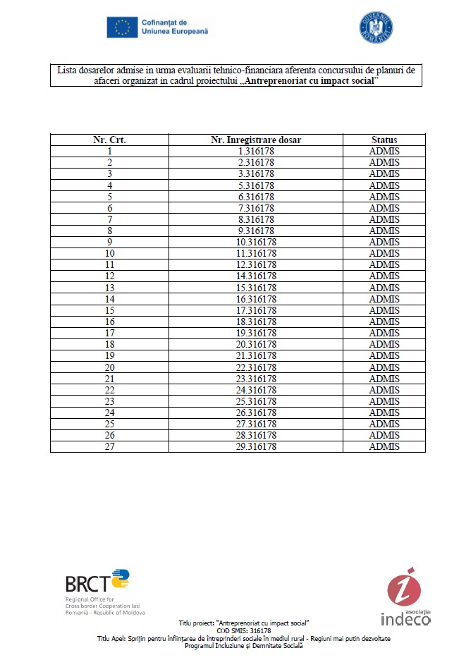 Asociația Biroul Regional pentru Cooperare Transfrontalieră Iași, beneficiar al proiectului PIDS – „Antreprenoriat cu impact social”, anunță publicarea rezultatelor FINALE ale evaluării tehnice și financiare aferente concursului de planuri de afaceri.